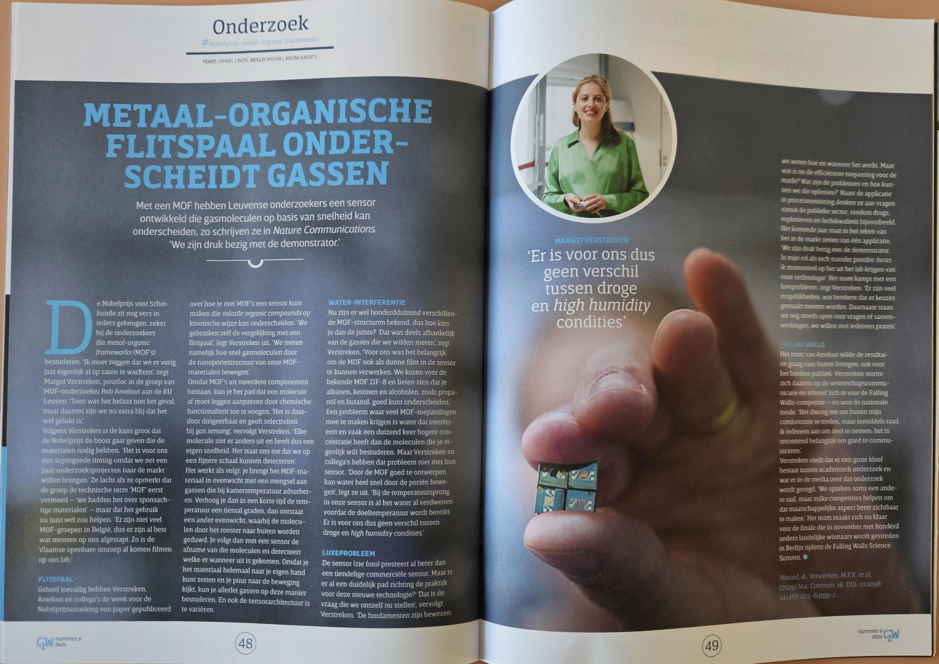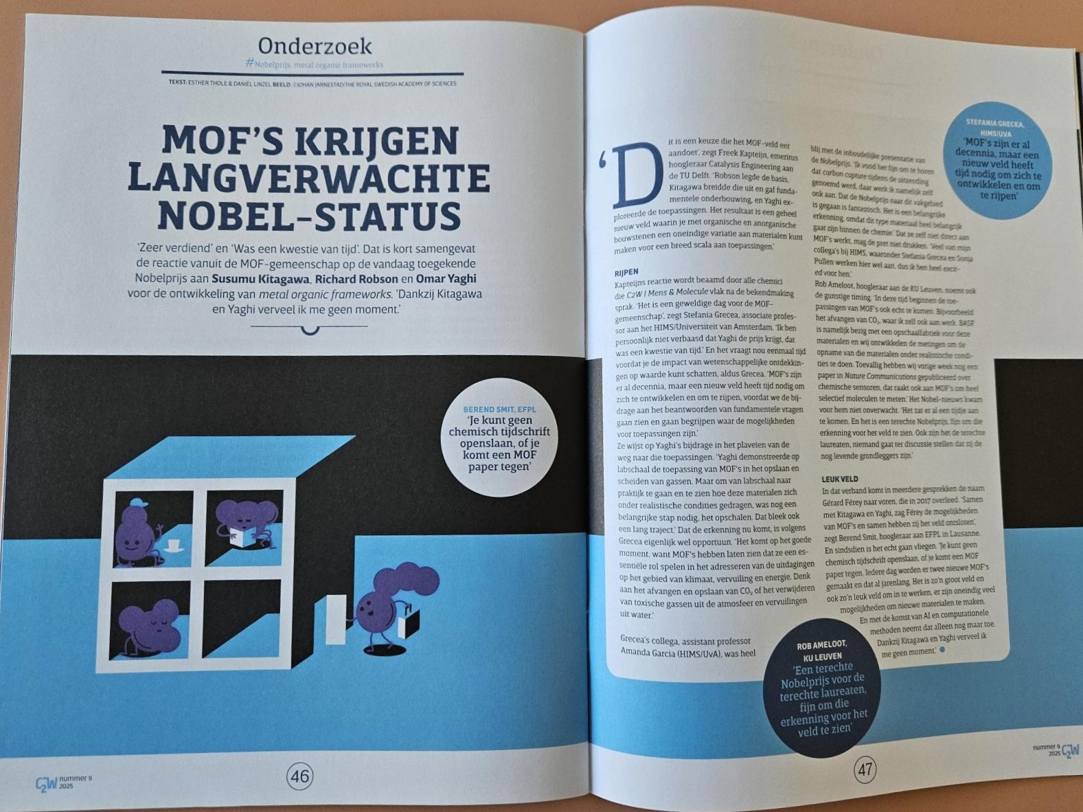The first article covers this year’s Nobel Prize in Chemistry, awarded to Susumu Kitagawa, Richard Robson, and Omar Yaghi for their pioneering work on metal–organic frameworks (MOFs). Our promotor, Prof. Rob Ameloot, was invited to share his enthusiasm for the award and reflect on the growing recognition of this exciting research field.